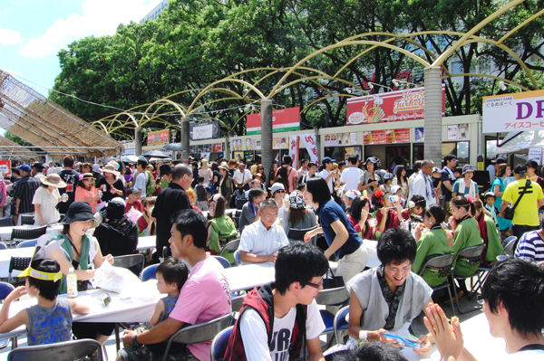 メインステージの北側のエンゼル広場では、ご当地ぐるめぱーくが開店。祭りには食が付きもの。今年も名古屋めしはもちろんのこと、今年は北海道ぐるめや三重県ぐるめなど全国の参加チームの地元から集まったご当地ぐるめを展開しています。本祭2日間は、ぐるめぱーく会場として演舞スペースとしてもスタートします!美味しい食を片手に、間近で迫力ある演舞もお楽しみください!