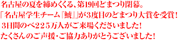 そして19年目のどまつり大賞の歴史にその名を刻んだのは―「名古屋学生チーム『鯱』(名古屋市中区)」のみなさん!3年ぶり3度目の大賞に輝きました!また併せて最優秀チームのどまつり大賞には、『内閣総理大臣賞』等が授与されました。1年間の集大成となる演舞が“どまつり大賞”という最高の栄誉となりました!